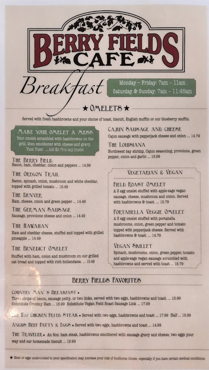 Welcome to Berry Fields Cafe, a hidden gem nestled in Centralia, Washington. This charming eatery is renowned for its attentive service and generous portions, making it a favorite among locals and travelers alike. The menu boasts a delightful range of options, showcasing everything from savory breakfasts to hearty lunches.
